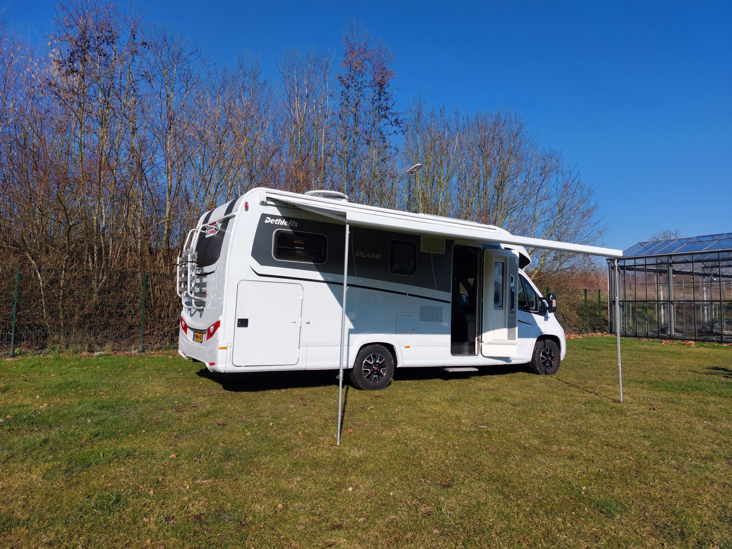 Onze Dethleffs Pulse is een zeer ruime en luxe camper. Geschikt voor een gezelschap van 1 tot en met 4 personen. Achterin de camper bevind zich een Queensbed, het voordeel van dit bed is dat men aan beide zijkanten in het bed kan stappen. Boven het zitgedeelte bevind zich nog een hefbed wat elektrisch te bedienen is. Vanwege de grootte van de camper, is deze voorzien van een aparte douche en aparte wc met wastafel. In het keukengedeelte is een ruime koelkast aanwezig, een 3-pits gasfornuis en voldoende opbergruimte voor de keukenuitzet. De stoelen voor in de camper zijn draaibaar zodat er een grotere zithoek gecreëerd kan worden.